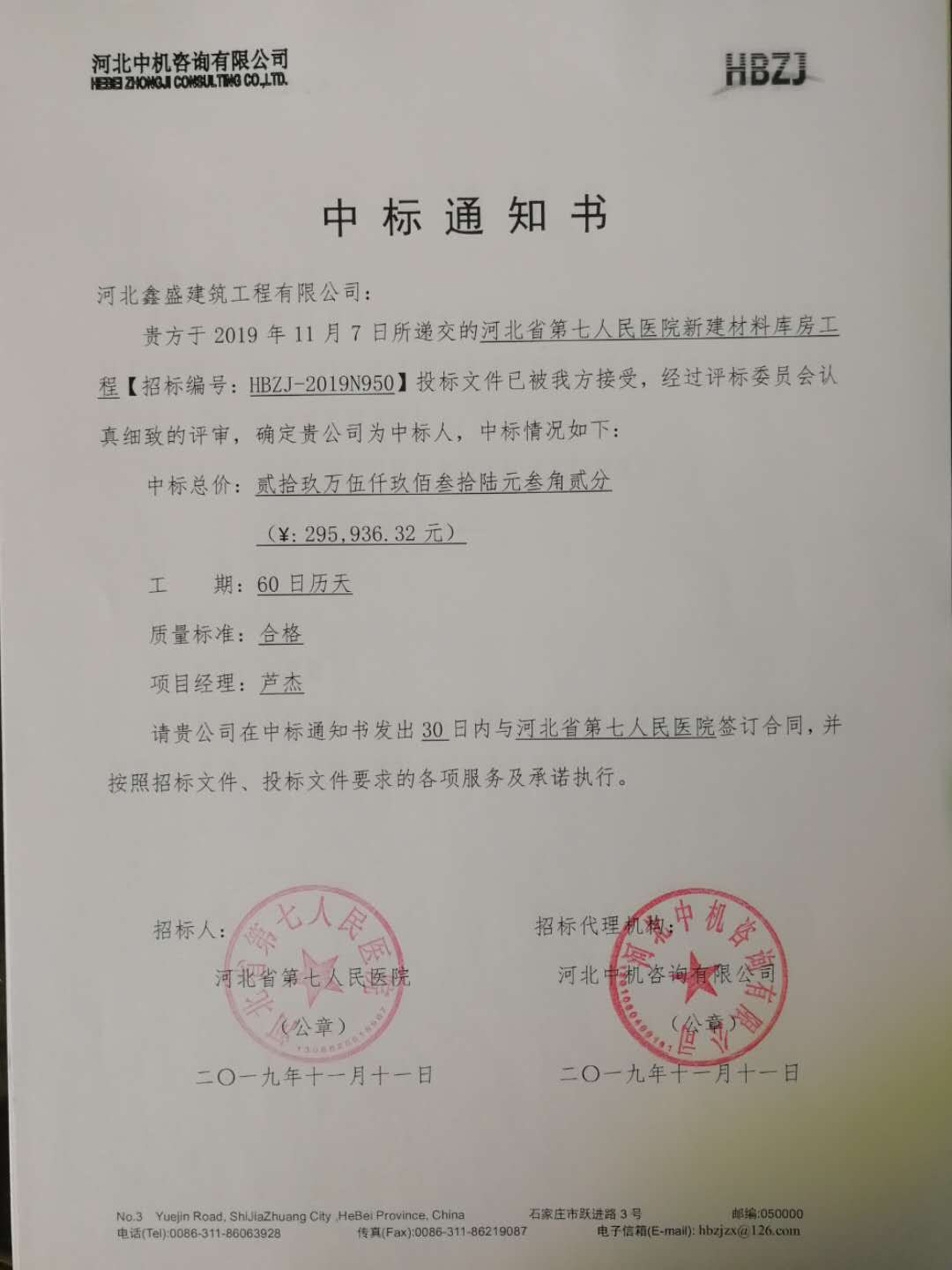 > 醫(yī)院動態(tài) > 新建材料庫房工程中標通知書新建材料庫房工程中標通知書