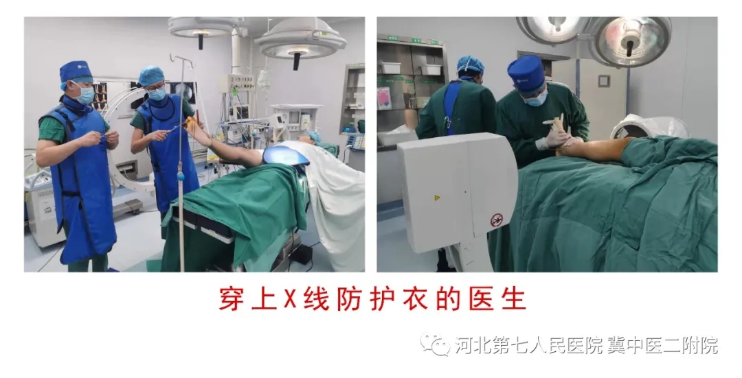 為患兒完善防護后,龐子軒主任、王玉冰副主任醫(yī)師穿好防護鉛衣,因手術需要,醫(yī)生的手和眼睛無法保護,在X線透視下,一位醫(yī)師為患兒保持骨折復位,另一位在X線透視下為患兒打入克氏針,取得骨骺完全復位。.jpg)