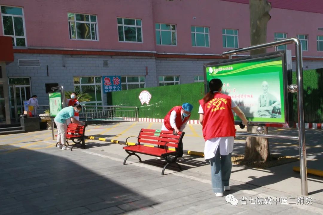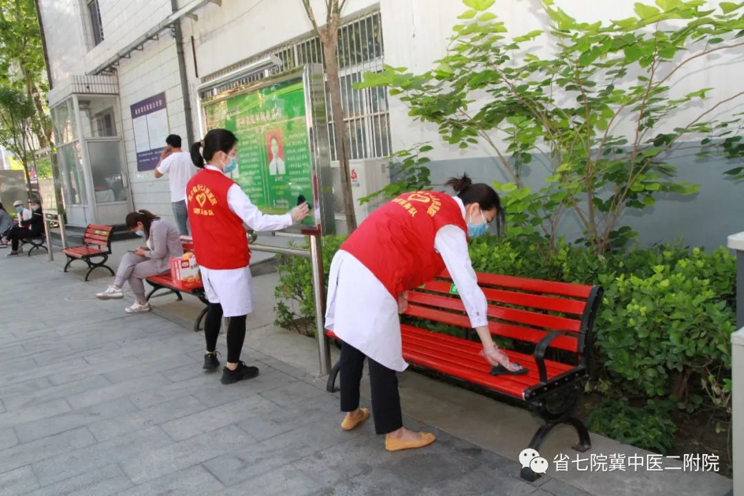 在進行簡單分工后,大家積極投入志愿勞動當中,紅色的身影遍布省七院住院樓前,撿拾煙頭、擦干凈座椅展板、對院內(nèi)吸煙不文明行為進行勸阻、協(xié)助就診……