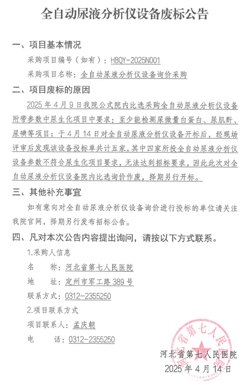 > 醫(yī)院動態(tài) > 全自動尿液分析儀設(shè)備廢標(biāo)公告全自動尿液分析儀設(shè)備廢標(biāo)公告