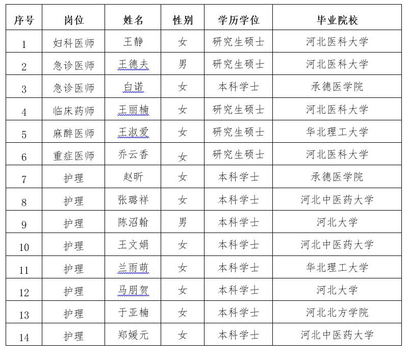 根據(jù)《河北省第七人民醫(yī)院2025年招聘工作人員公告(非在編)》,我院經(jīng)過資格審查、理論考試、面試、體檢、考察等程序,擬聘用以下14人為我院工作人員,現(xiàn)予以公示。